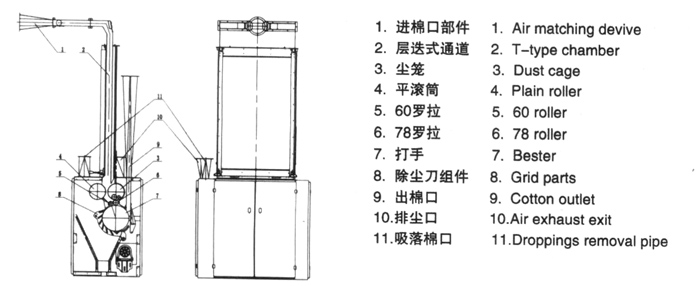 本机配置于混棉工序之后,对原棉作进一步开松、除杂、可除去去不孕籽、僵死棉,或细小陈杂。本机可单用一台,也可两台串接使用。
